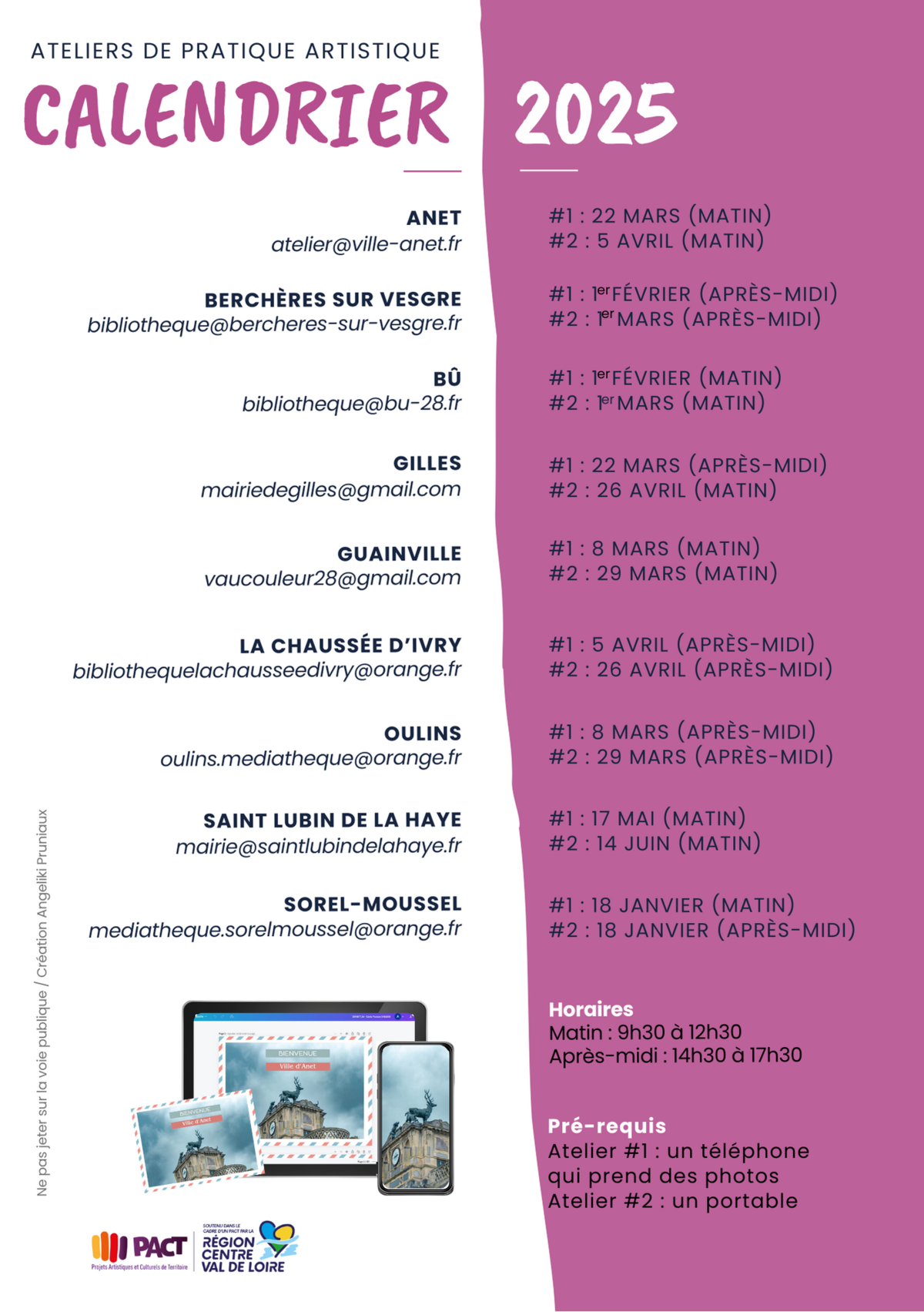 ARCHITECTURE ET PATRIMOINE, c'est sur ce thème que se déroulent cette année les ateliers de pratique artistique qui auront lieu dans les 9 communes partenaires du Projet Culturel et artistique de territoire (PACT) porté par le Dianetum/Ville d'Anet. Angeliki Pruniaux, artiste photographe sorélienne, accompagnera les habitants du territoire dans la création d'une carte postale mettant en valeur le patrimoine architectural des communes. Ces ateliers se tiennent dans les bibliothèques ou salles communales des communes d'Anet, Berchères-sur-Vesgre, Bû, Gilles, Guainville, La Chaussée d'Ivry, Oulins, Saint-Lubin de la Haye et Sorel-Moussel ( Gratuit, ouvert à tous à partir de 10 ans et inscriptions obligatoires par mail ).